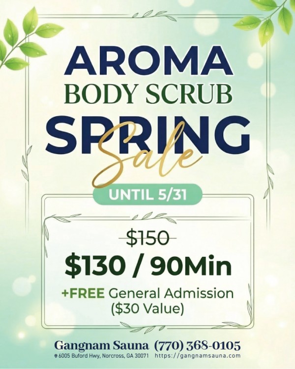 This spring, treat your skin to the ultimate purification ritual at Gangnam Sauna. Experience our premium Aroma K-Scrub & Oil Therapy—where deep exfoliation meets the healing power of essential oils. ??♀️ For 90 minutes, let our experts melt away the stress, leaving your skin incredibly soft and your mind perfectly at peace. Spring Celebration Special: • Aroma Body Scrub & Oil Massage (90 min): ONLY $130 (Was $150) • BONUS: Includes FREE General Admission ($30 Value)! Enjoy full access to our signature saunas and pools with your treatment. It’s the complete K-Wellness journey you deserve. Offer valid through May 31st. 6005 BUFORD HWY, NORCROSS GA 30071 No appointment needed for sauna. Call or visit us to book your scrub!