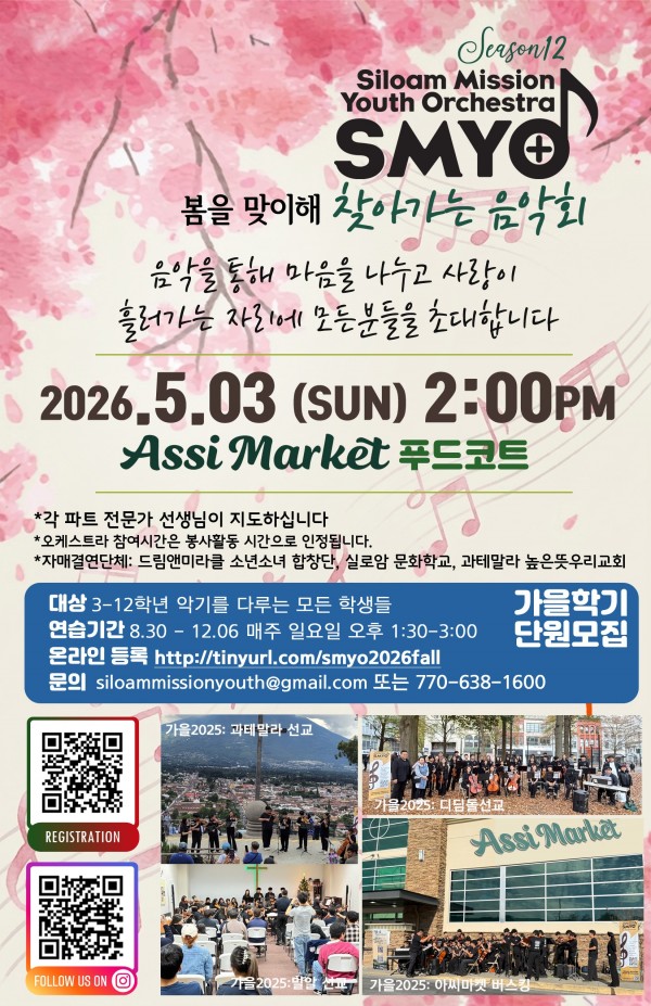 SMYO (실로암 미션 유스 오케스트라) 에서 5월3일 오후 2시 아씨 마트 앞에서 음악회를 가질 예정입니다~
