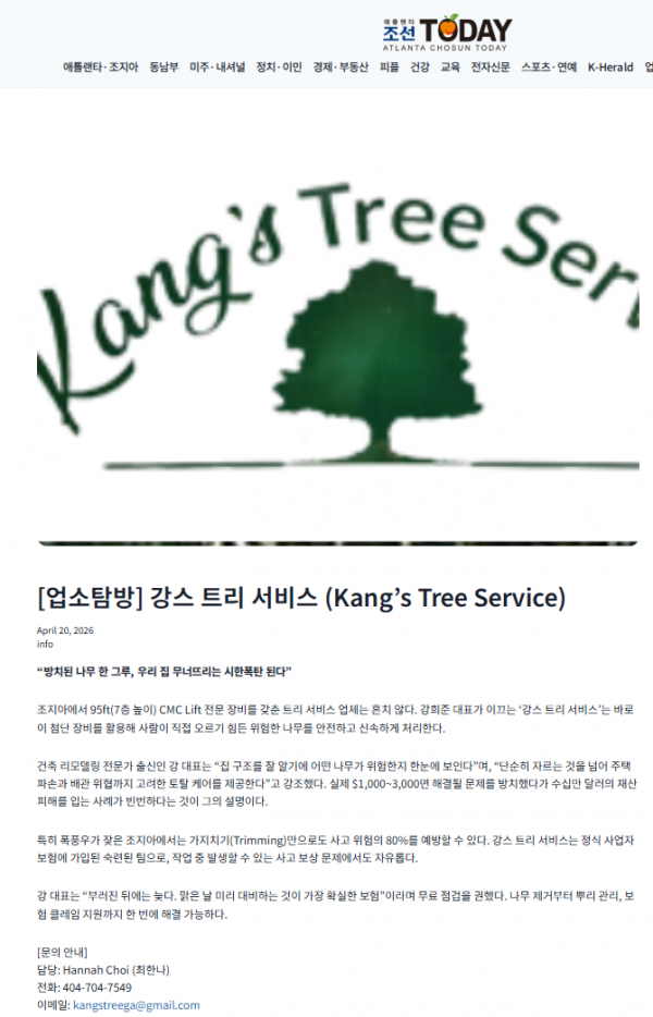 - 다음글강스트리서비스(Kang's Tree Service) 중앙일보 기사입니다. 26.04.20