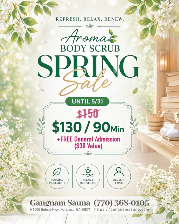 #GangnamSauna#AromaBodyScrub#SpringSale#SpaDay#SelfCare#RelaxAndRenew#SmoothSkin#BodyScrub#SaunaExperience#NorcrossGA#KoreanSpa#WellnessJourney