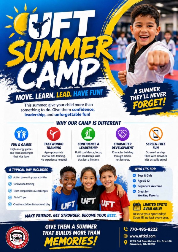 At United Family Taekwondo Summer Camp, kids move all day, build leadership skills, make real friends, and have FUN in a safe, structured environment parents trust.