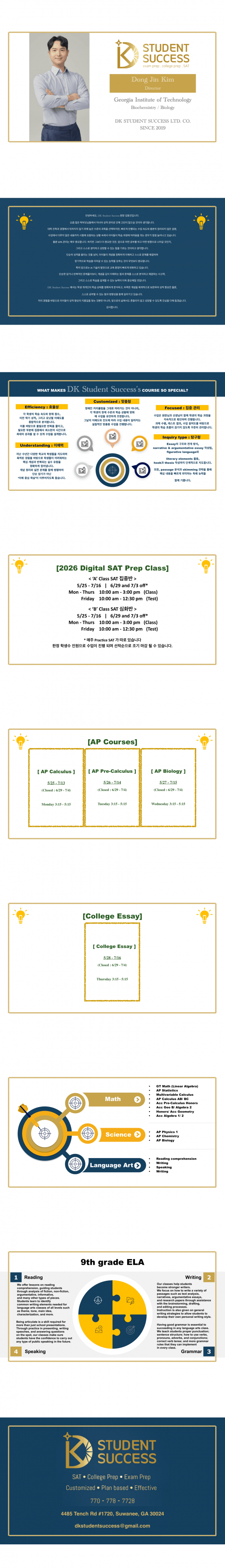 SAT 같은 경우 Diagnostic 시험을 통해 심층 분석을 하고 각 학생들의 부족한 부분의 토픽과 시험 점수에 따라Reading, Writing, and Math에서 Regular/ Advanced/ Top 1 % 준비로 단계별로 수업에 들어가 틀렸던 부분의 rules, equations, and concepts들을 진행해 짧은 시간 안에 최대한의 효과를 낼 수 있게끔 아이들의 pace와 상황에 따라 계획이 만들어질 예정입니다. 매번 업데이트되는 SAT 시험 양식에 따라 40권가량 되는 교제에서 액기스만 선별해 수업이 진행될 계획입니다.