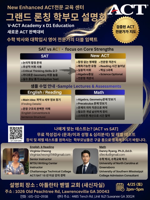 아틀란타 유일의 New ACT 전문 교육센터 론칭 설명회 ( 무료 샘플 수업 신청하세요!!)