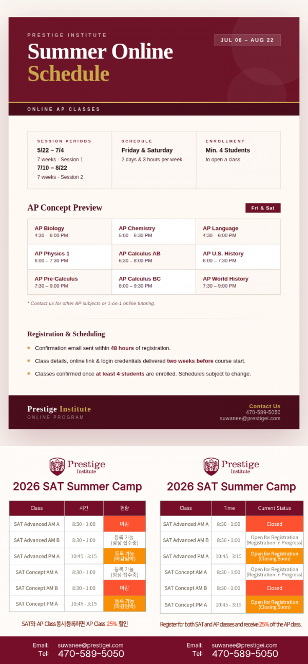 [Prestige Suwanee] 이번 여름이 내 아이의 성적을 결정합니다 (Prestige 2026 SAT 여름 캠프)