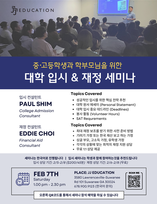 [명문입시학원] 2월 7일(토) JJ 대학입시 & 재정보조 핵심전략 세미나 (예약필수)