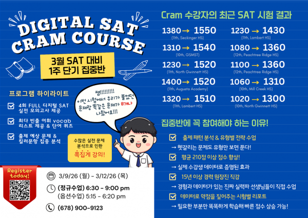 3월 9일부터 3월 12일까지 단 4일간 진행되는 Digital SAT Cram Course!