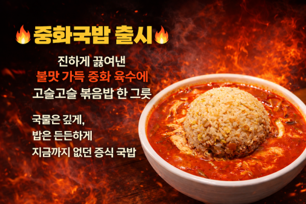홍보 왕서방 중화요리 신메뉴 출시 "중화국밥" 페이지 정보 작성자 왕서방중화요리 작성일 26-01-08 13:58 조회 118 댓글 0 본문 왕서방 중화요리 신메뉴 출시 "중화국밥" 다음글 SUNNY WINGS- 1월 스페셜 세일 BEST FLAVOR & PRICE IN TOWN 댓글목록 0 등록된 댓글이 없습니다.