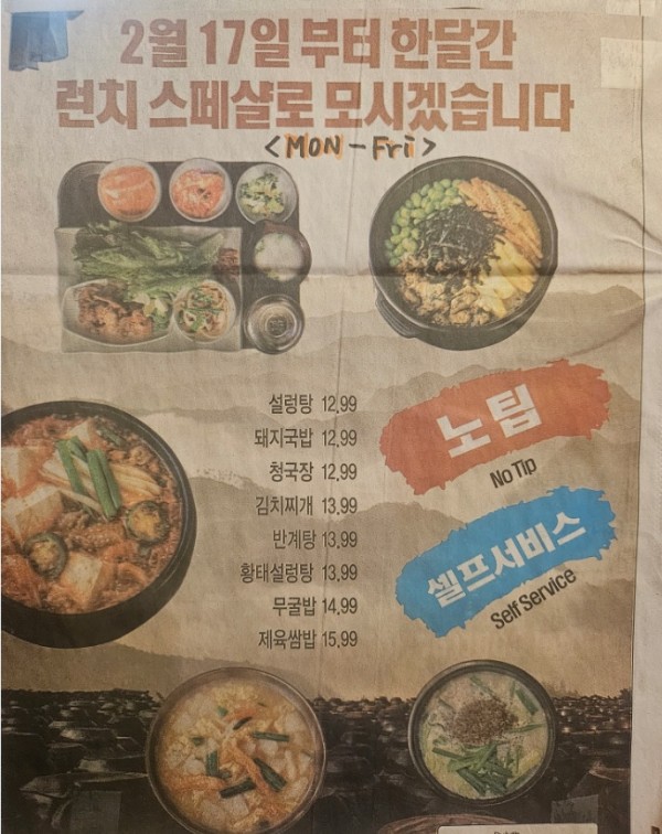 홍보 둘루스 장독대 런치 스페셜<2/17-한달간> 노팁! 셀프서비스!