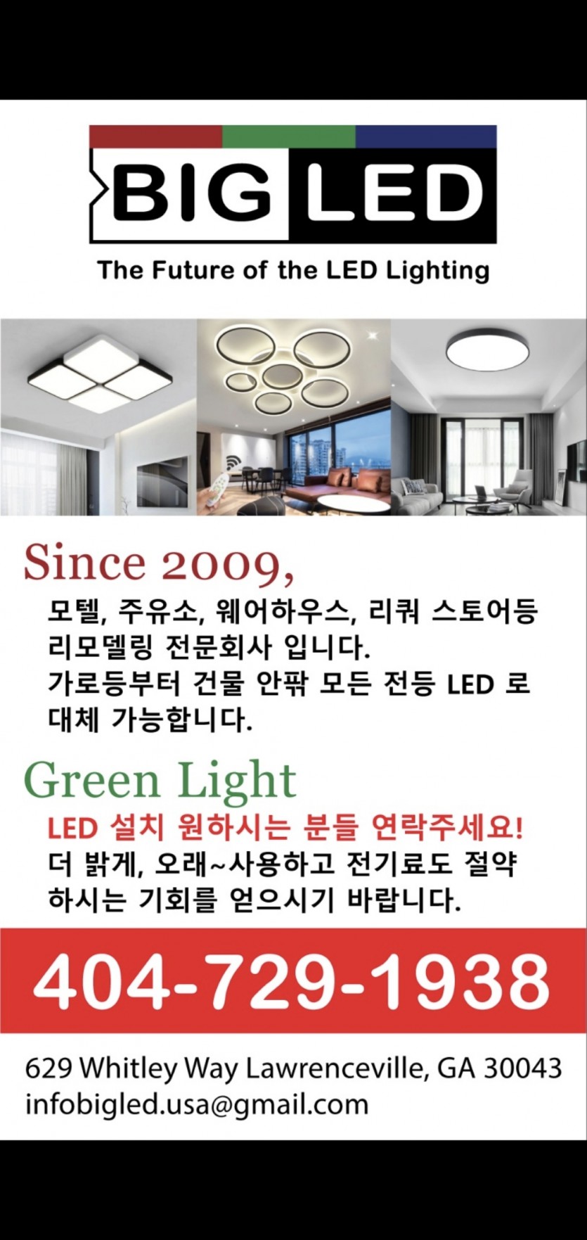 기존 전구 대비 전기료가 2/3이상 절약되며 두배이상 밝고 (기존등 2개를 하나로 대체) 기존 개스등과 다른 다이오드를 사용해 공해가 없고 인체에 해롭거나 깨져서 다치는등의위험이 없으며 수명이 기존 등보다 3배이상 길고 노란색 2500k 부터 흰색 6500k까지 원하시는 밝기를 조절할수 있는 장점이 있습니다. 가로등부터 건물 보안등, 가게 형광등 가정집의 모든 전등 교체 가능 합니다. 너무 자주 전구 교체가 필요하신 분들과 Light censor 나 Motion Censor 필요하신 분들, 메세지 보드나 개스 가격 디지털 싸인으로 바꾸실 주유소 주인분들 어두운 환경에서 벗어나고픈 분들은 아틀란타에서 15년동안 영업해온 BIG LED 404-729-1938 email : infobigled.usa@gmail.com으로 문의해 주세요.... 감사 합니다.