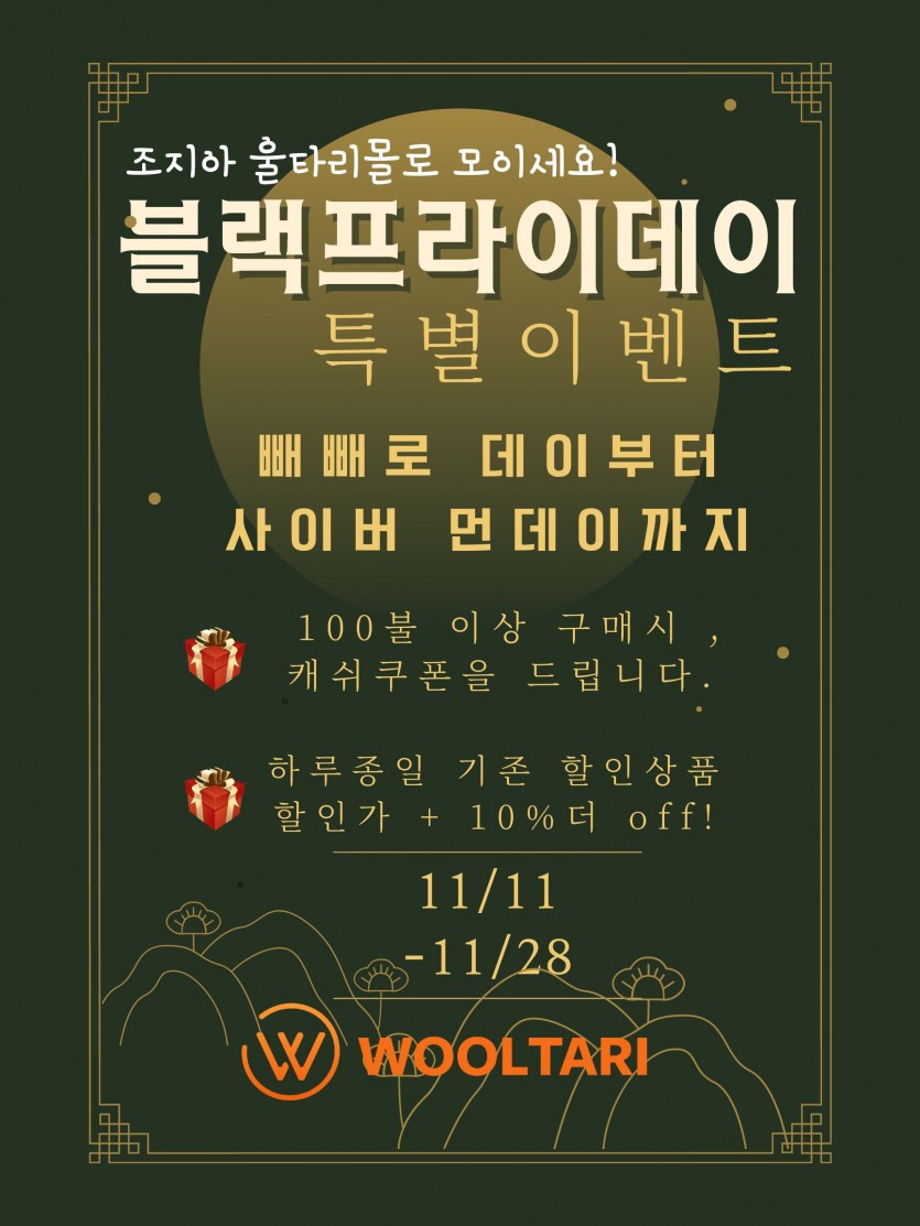 1. 11월 11일(빼빼로데이)부터 11월 28일(사이버먼데이)까지 100불 이상 구매시, 횟수제한 없이 캐쉬쿠폰을 드립니다.
