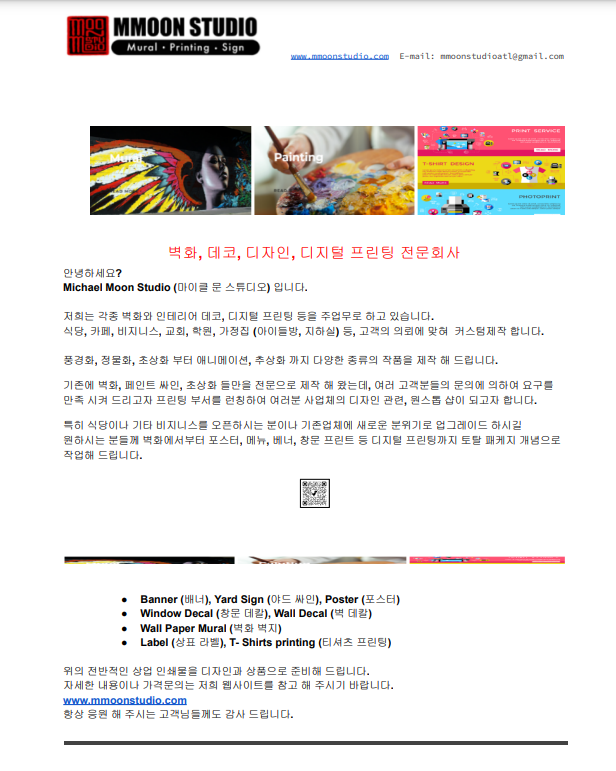 기존에 벽화, 페인트 싸인, 초상화 들만을 전문으로 제작 해 왔는데, 여러 고객분들의 문의에 의하여 요구를 만족 시켜 드리고자 프린팅 부서를 런칭하여 여러분 사업체의 디자인 관련, 원스톱 샵이 되고자 합니다.