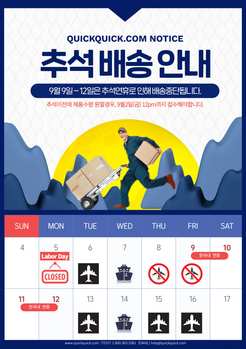 한국내 4일간의 추석연휴로 인해, 세관통관/국내배송 모두 중단되는 시기입니다.