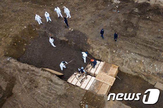 4월 9일 뉴욕의 하트아일랜드에서 인부들이 코로나19 사망자를 집단매장하고 있다.© 로이터=뉴스1 © News1 |