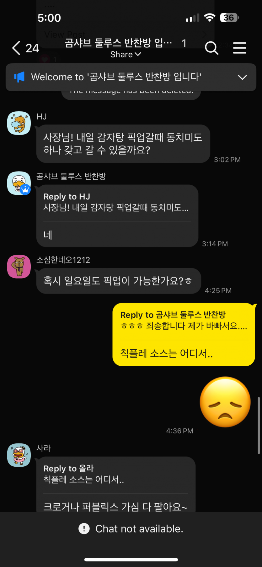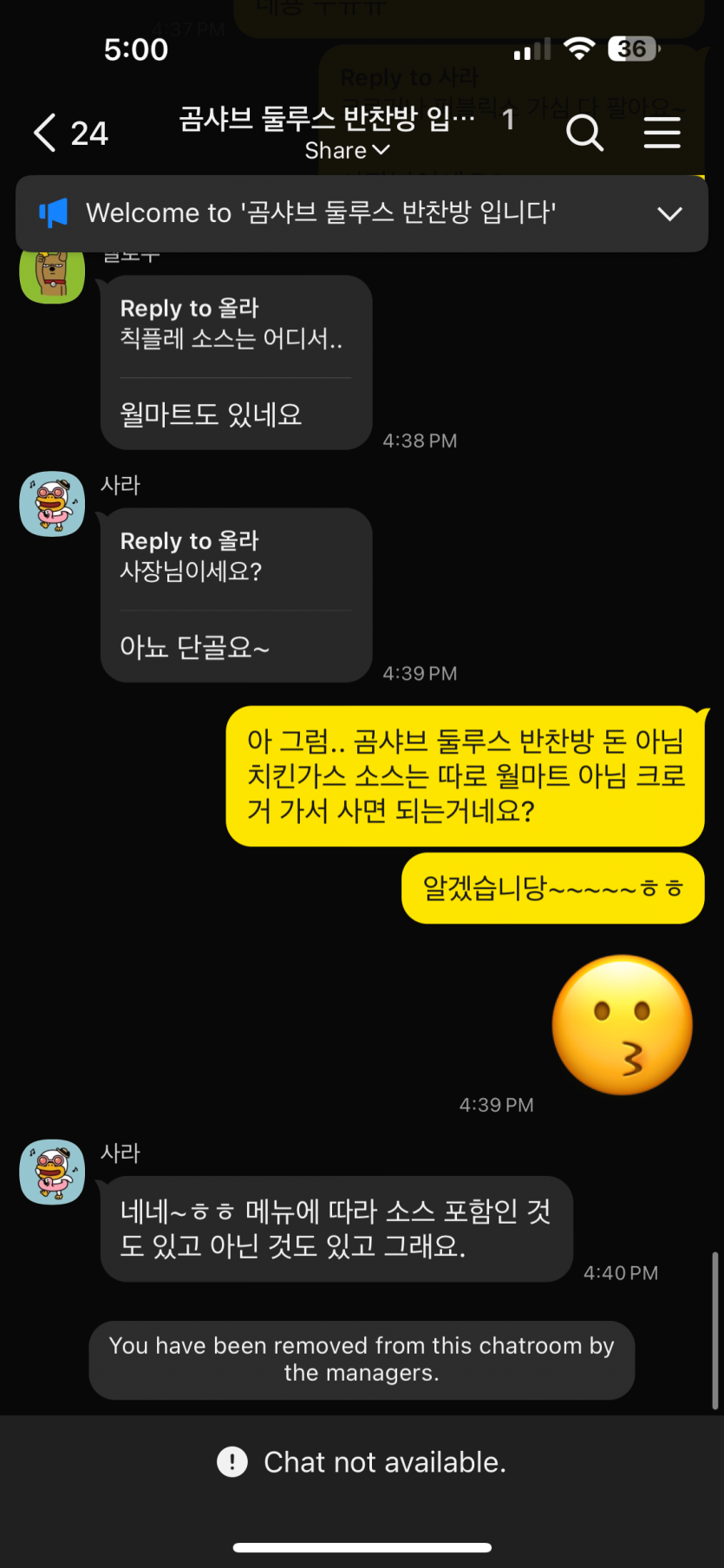 성의 없는 답변이 이어졌고, 이후 아무런 공지나 안내 없이 저만 채팅방에서 강퇴되었습니다.