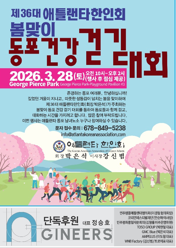 N-GINEERS에서 후원하고 36대 애틀랜타 한인회에서 주최하는 봄맞이 동포 걷기 대회에 많이 참석하셔서 건강도 챙기시고 맛있는 식사와 담소도 즐기시는 정겨운 시간 보내시기 바랍니다^^