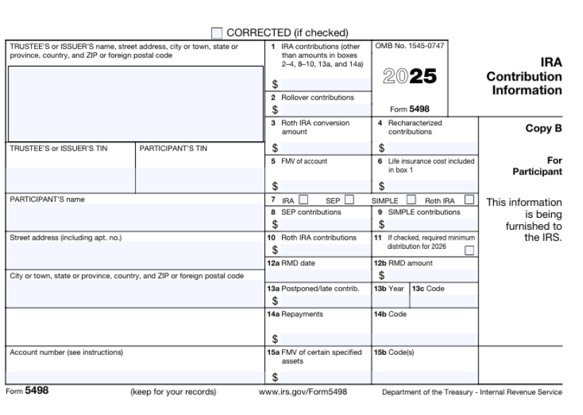 2025년 IRA 저축을 2026년 3월에 넣었다고 하겠습니다. 세금보고는 2025년 것으로 처리할 수 있습니다. 나중에 오는 Form 5498이 “그 돈을 실제로 넣었다”는 기록이 됩니다.