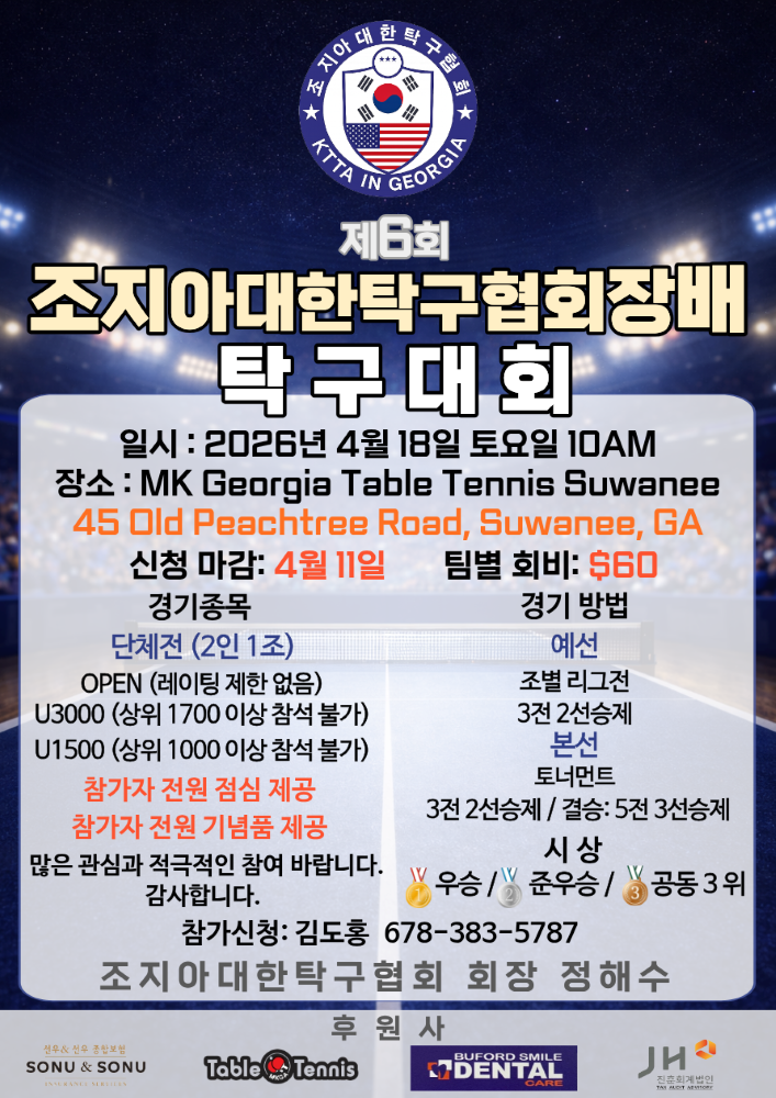 제6회 조지아대한탁구협회장배 탁구대회 안내 4/18일 토요일 오전 10시