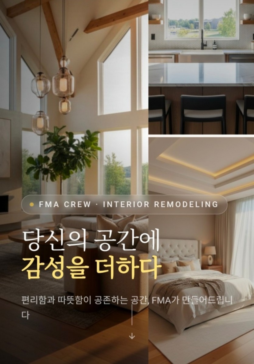 어렵고 복잡한 리모델링, 이제 고민만 하지 마세요. 저희 FMA Crew가 최신 트렌드와 기술을 바탕으로 당신의 일상이 편안해지는 맞춤형 공간을 함께 그려드립니다.