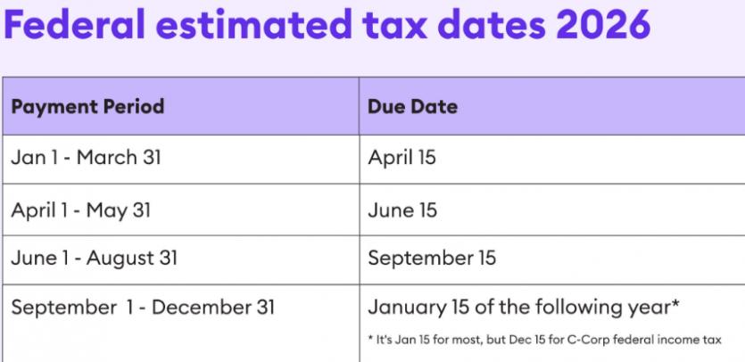 2026년 개인 연방 Estimated Tax 납부일은 다음과 같다.