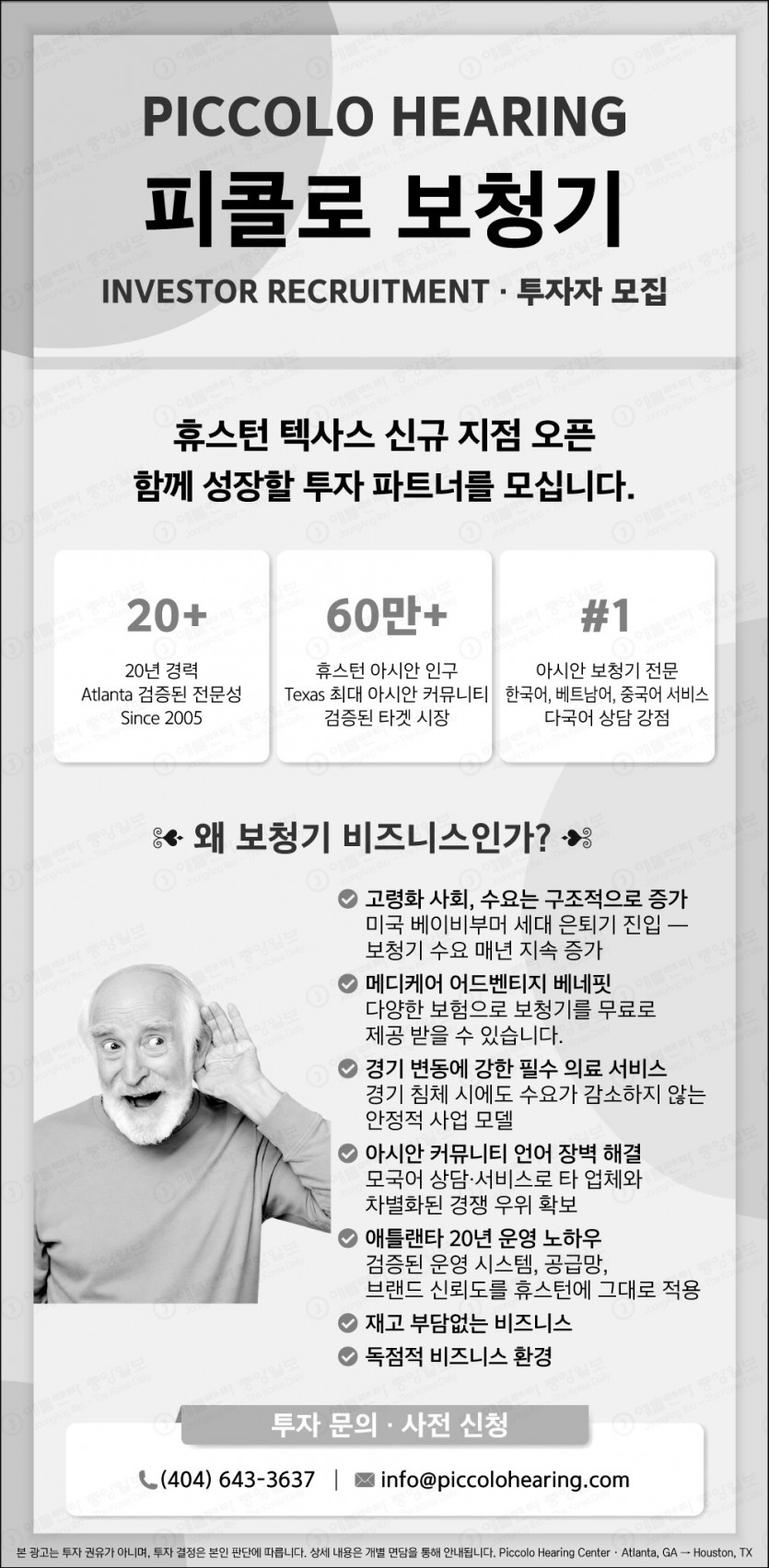 피콜로 보청기 텍사스 휴스톤 지점 확장에 함께하실 투자 파트너를 모십니다.