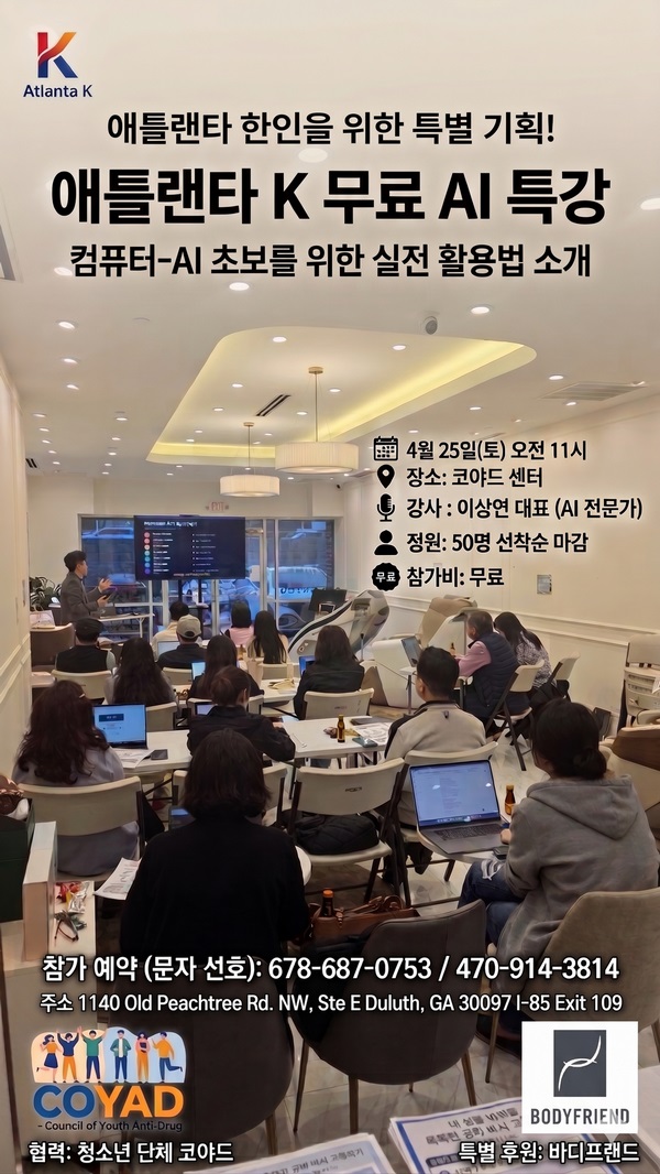 애틀랜타K가 오는 25일(토) 오전 11시 둘루스 코야드(COYAD) 센터에서 지역 한인을 위한 무료 AI 특강을 진행한다.
