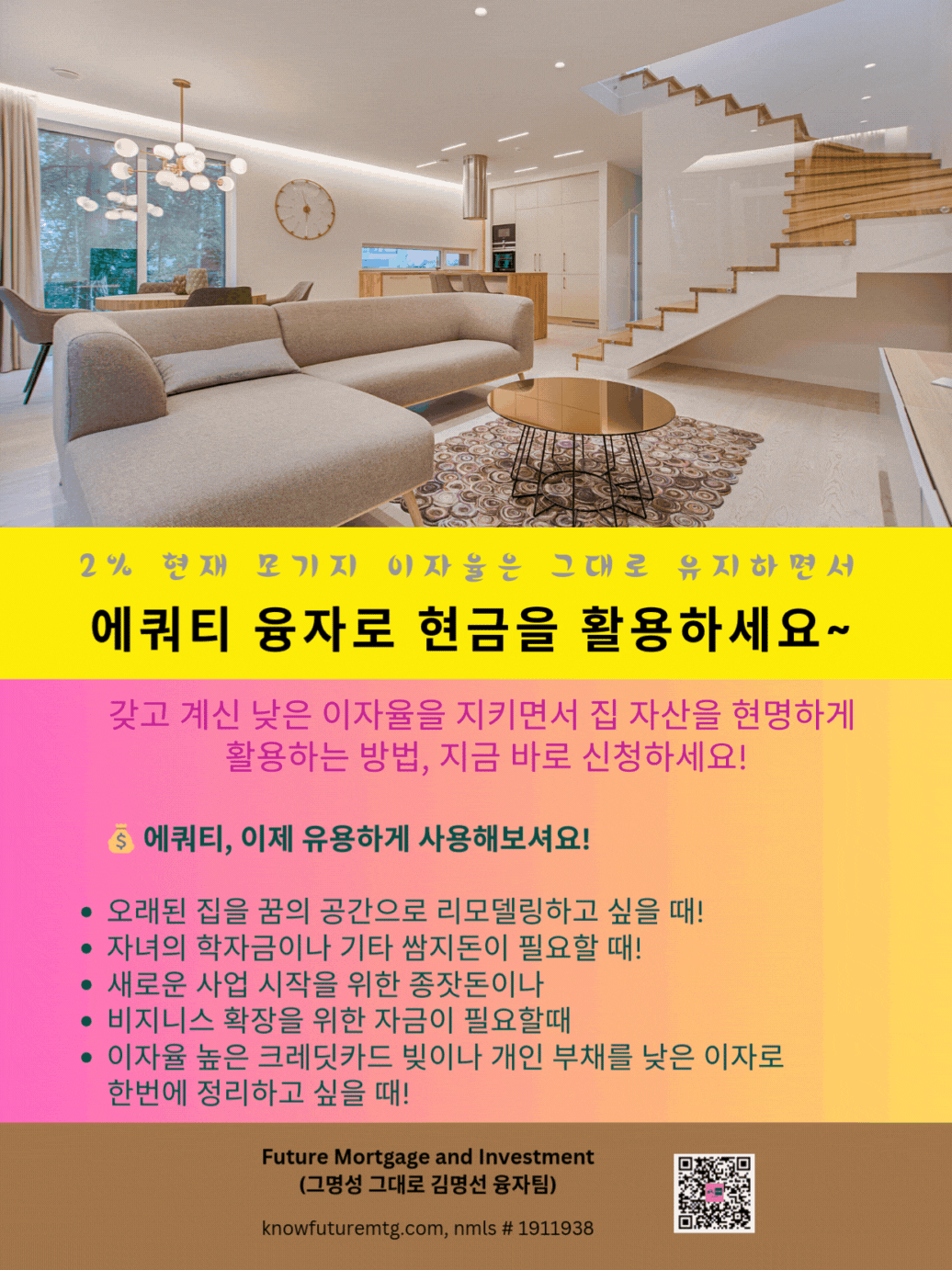 '내 집'이란 은행 잔고에 돈이 쌓여 있다고?! 에쿼티 융자로 현금을 활용하세요~