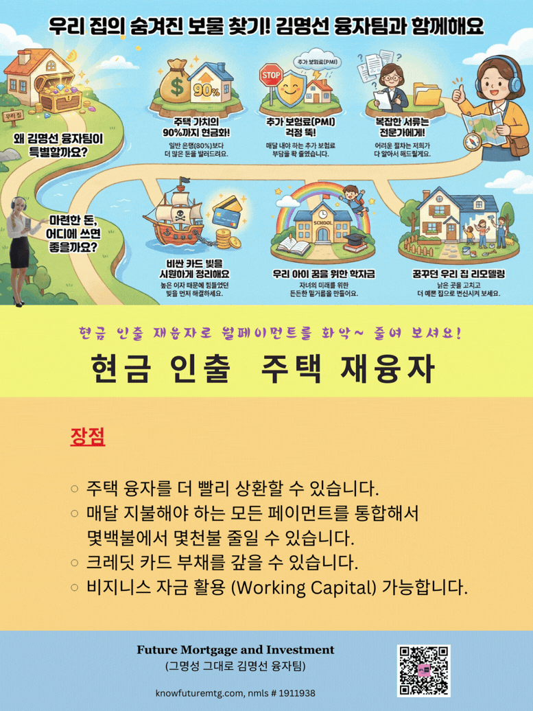 • 모든 대출은 최종 심사 및 승인 절차를 거쳐서 최종 융자 승인이나 융자 거부가 될 수 있읍니다.