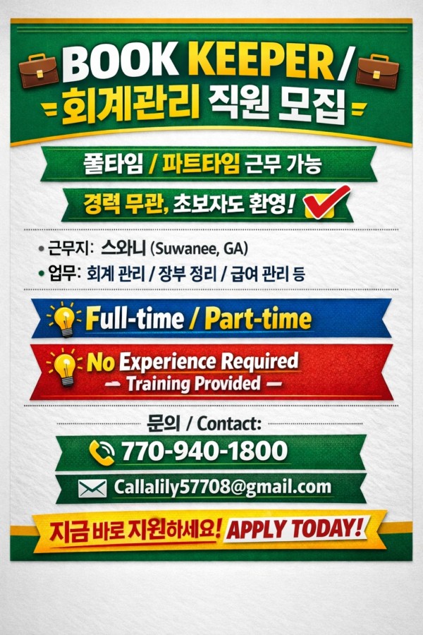 BOOKKEEPER (회계직원모집) > 구인/구직