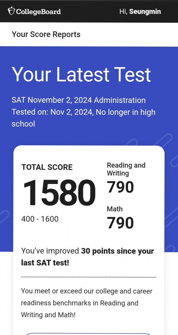 저는 10학년/15세 때 첫 ACT를 35로 마무리하고, 다음 해 11학년/16세 때 PSAT 1480점과 SAT 1550점을 또 첫 시도에 달성해서 National Merit Finalist를 따게 되었습니다. 그 후에는 밴더빌트 대학교에서 학사 과정을 밟다가 최근 졸업했구요. 최근 11/2자 Digital SAT 1580점 달성하였습니다 (참고문서 2).