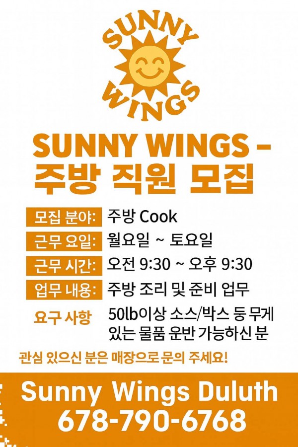 SUNNY WINGS DULUTH – 주방 직원 모집