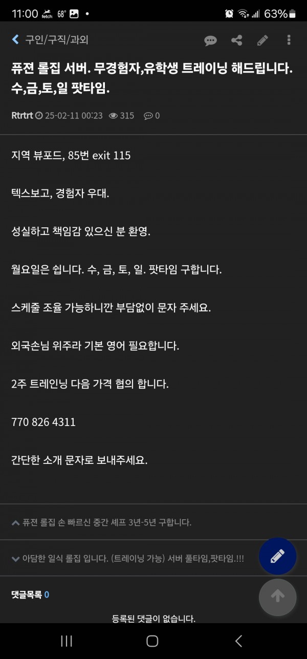 구인 퓨젼 일식 롤집에서 팟타임 서버 구합니다. 수,목,금,토,일 스케쥴 조율가능합니다.