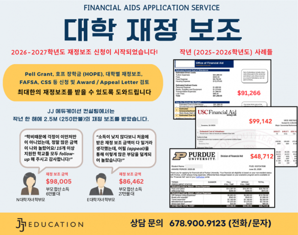 JJ 재정보조 서비스 문의 및 신청은 전화(678-900-9123)나 email(office@jjedc.com)으로 연락주세요.