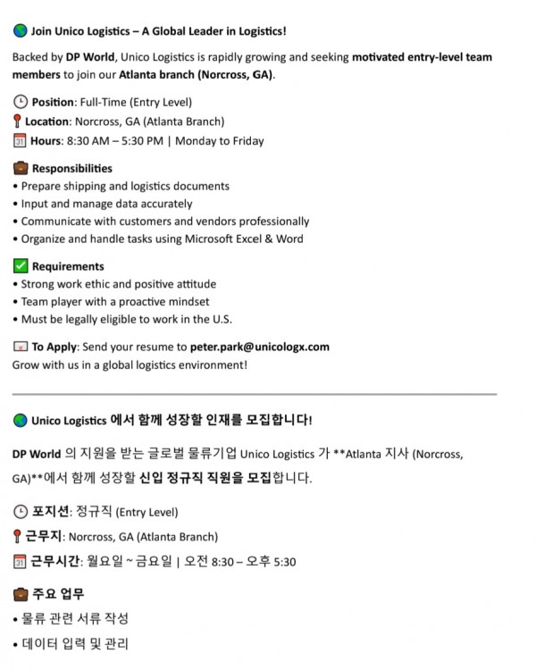 구인 운송회사에서 Logistics Operation 업무 직원 구합니다