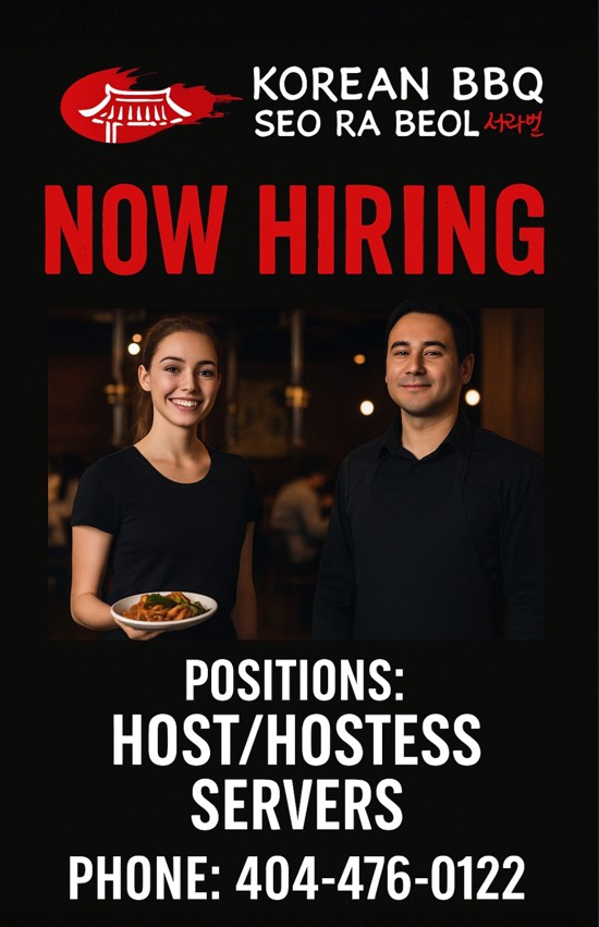 구인 둘루스 서라벌 식당에서 함께 일할 써버를 모십니다