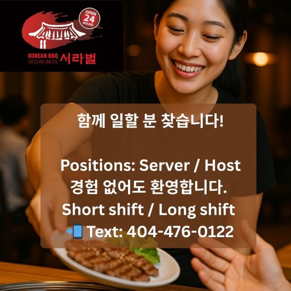 애틀랜타대표 한식서라벌과함께 일하실분을 찾습니다.