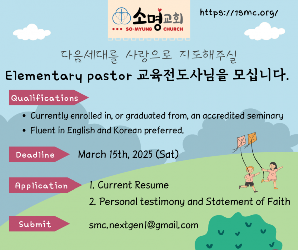 So-Myung Church (SMC) is a Global Methodist Korean-American church located in Suwanee, GA. With consistent growth in our elementary ministry, we are looking for pastoral staff to join our Next Generation ministry. If you have a clear passion in engaging, serving, and leading elementary students, apply to the email below with a complete application.