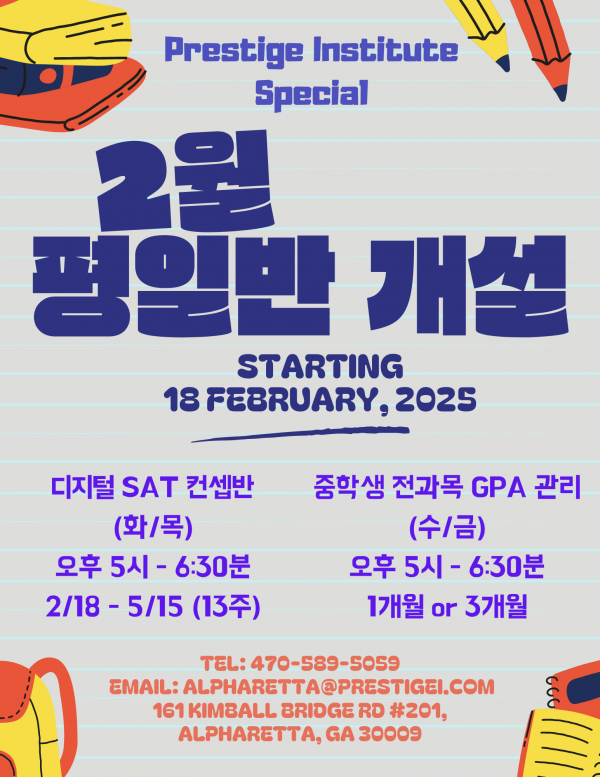 Prestige Institute에서는 2월부터 디지털 SAT 컨셉반과 중학생 전과목 GPA 관리 프로그램을 위한 평일반을 새롭게 시작합니다.