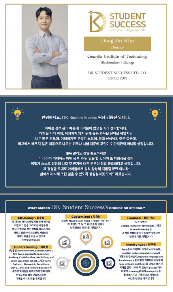 저는 조지아텍에서 Biochemistry를 전공하고 Biology를 부전공 하여 제약회사를 다니다가 퇴사한 후 개인 과외로 시작해 학원을 운영 하면서 집단 따돌림을 당하여 몇 년 동안 학교를 가지 못하다 마음이 열려 학교를 가게 된 학생, 게임에 중독되어 부모님 마저 아이에게 손을 쓸 수 없게 된 학생, 부모님과 언어의 장벽으로 인해 의사소통에 문제가 된 학생, 본인의 꿈을 찾아 홈 스쿨링을 선택한 학생, 습관이 안 잡혀서 공부하는 방법을 모르는 학생 등 수많은 케이스들의 아이들을 만나보았습니다.