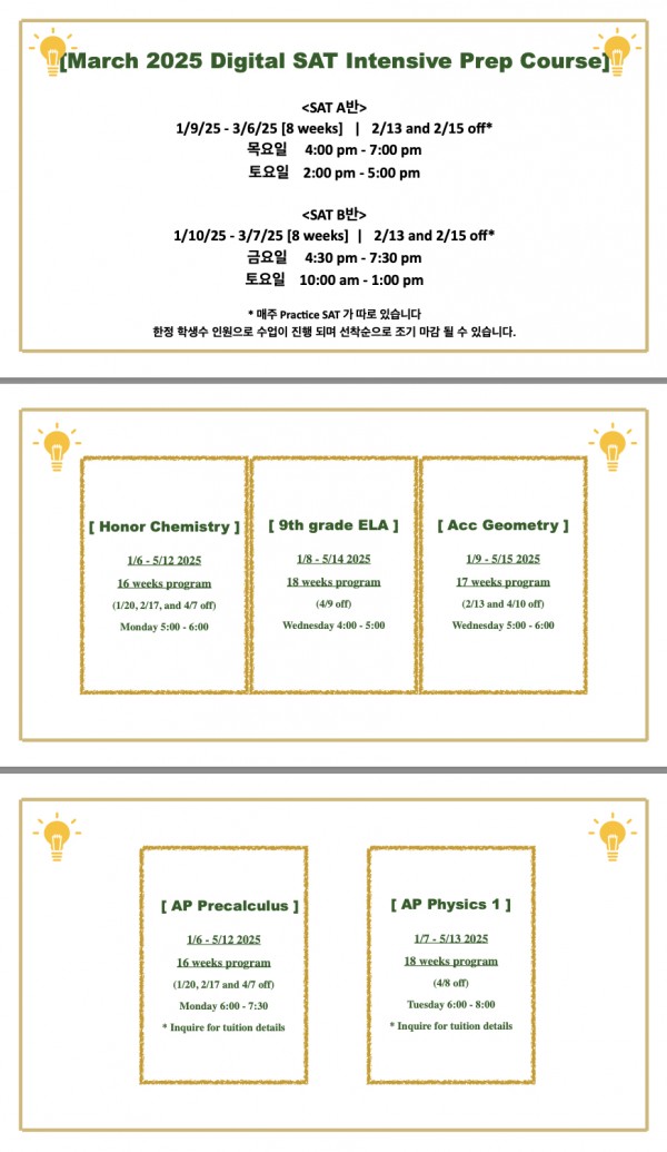 SAT 같은 경우 diagnostic 시험을 통해 심층 분석을 하고 어떻게 공부를 효율적으로 하는지, 부족한 부분의 토픽이 무엇인지에 따라 Reading, Writing, Math에서 각각 12, 20, 28개의 토픽을 이용해 많이 틀렸던 부분의 rules, equations, and concepts들을 진행해 짧은 시간 안에 최대한의 효과를 낼 수 있게끔 아이들의 pace와 상황에 따라 스케줄이 만들어질 예정입니다