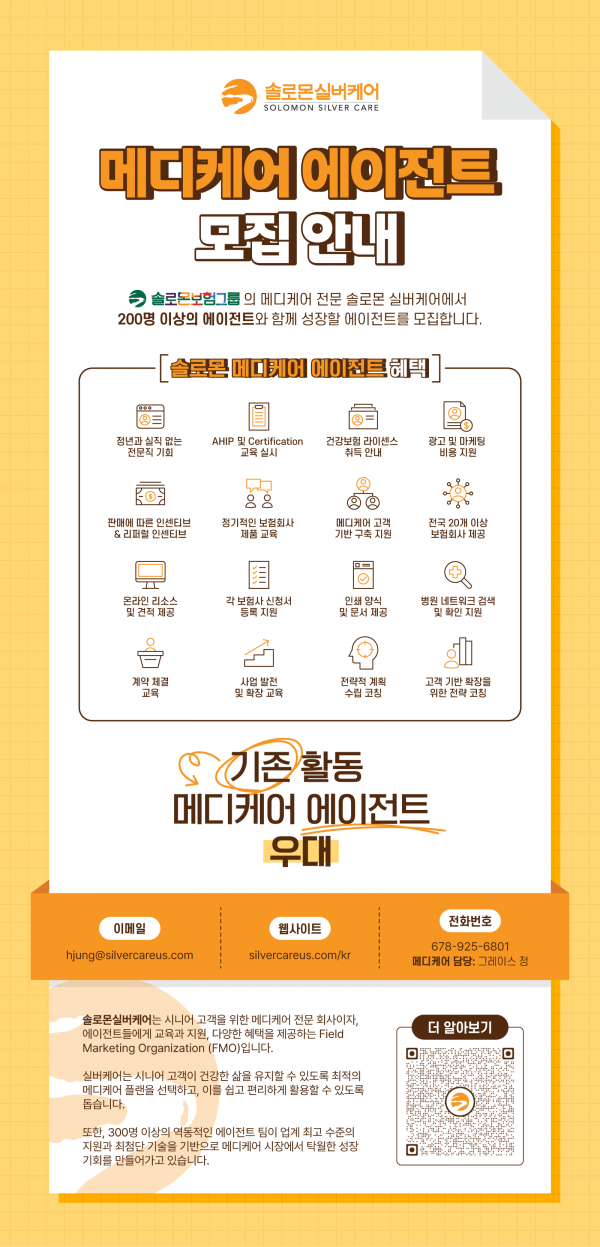 메디케어 에이전트 모집 - 솔로몬보험그룹 에이전트만을 위한 든든한 지원 및 혜택 제공! > 구인/구직