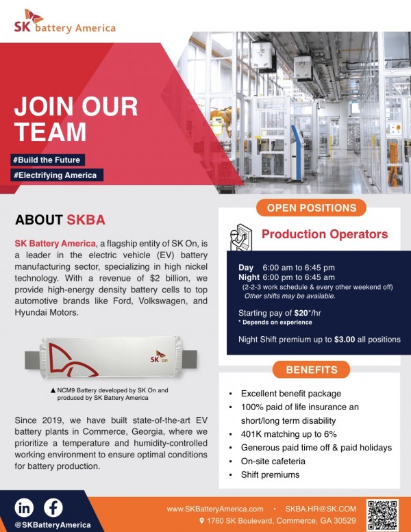 구인 [SK 배터리 아메리카] 생산직 오퍼레이터 모집