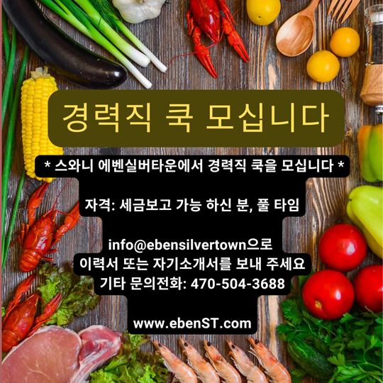 스와니에 위치한 에벤실버타운에서 경력직 쿡을 모십니다.
