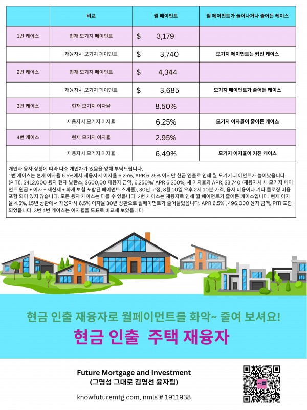 3. 월 모기지 페이먼트는 현재 지불하시는 금액보다 많이 나갈 수 있습니다.