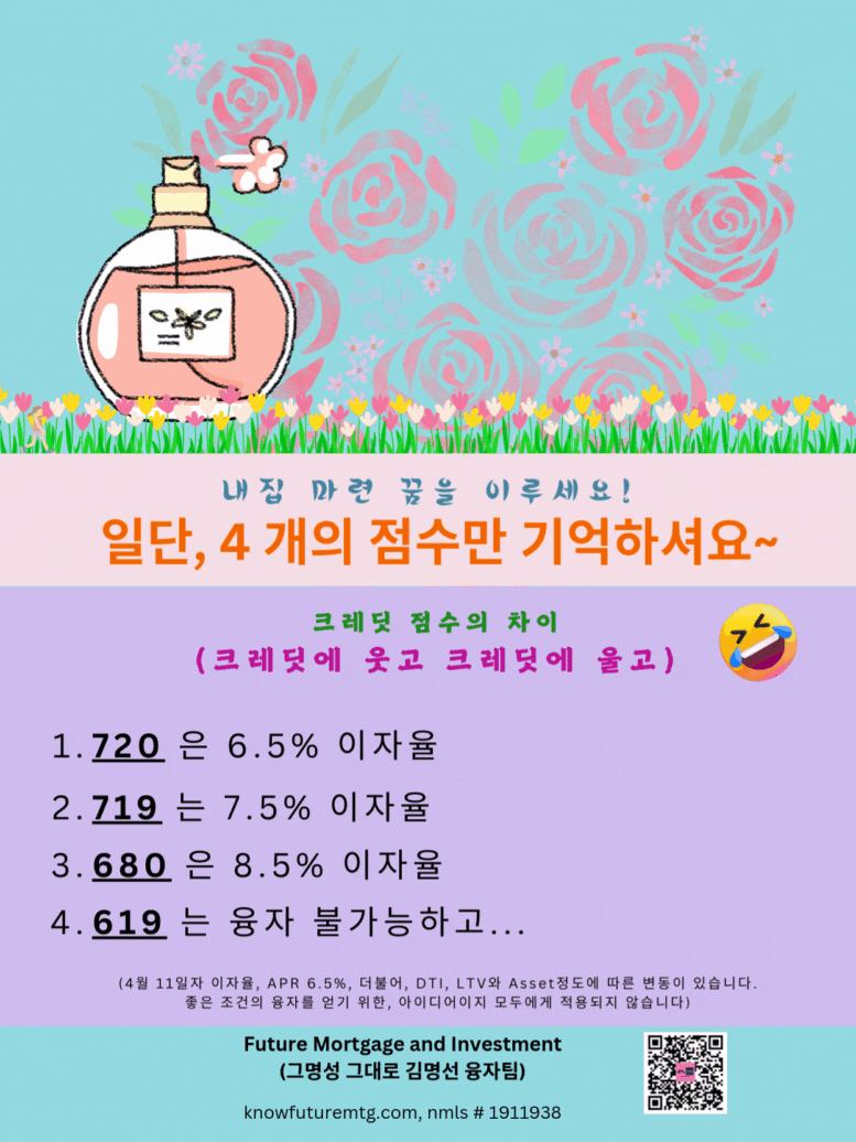 (4월 11일자 이자율, APR 6.5%, 더불어, DTI, LTV와 Asset정도에 따른 변동이 있습니다.