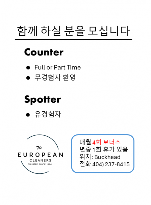 구인 세탁소에서 카운터와 스파터 모십니다