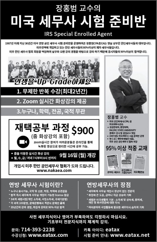 강의스케줄은www.eatax.net의 커뮤니티란에서 확인하면 된다. 문의는 714-393-2238, 공인회계사 겸 세무사 장 홍범 , 카톡 아이디 eatax, 웹싸이트 www.eatax.com