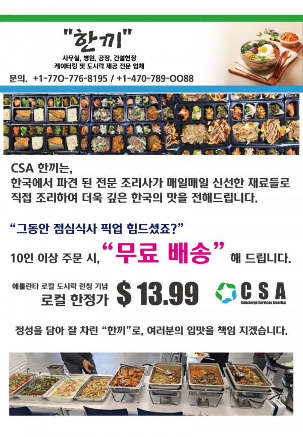 저희 "한끼"에서 로컬 런칭 기념으로 10인이상 직원식사 주문시 "무료배송" 해 드립니다. -스와니 뷰포드 둘루스 쟌스크릭 킹스턴  지역한정
