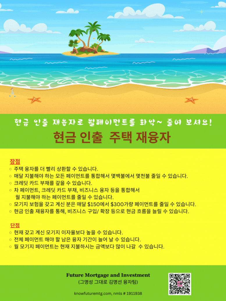 주의 사항: 융자는 돈 (신용)이고 돈 (신용) 은 빚입니다. 융자를 잘 활용하면 자산 증식이나 경제 생활에 큰 이익을 주지만, 그렇지 못할 경우, 집을 잃거나 경제적인 파국의 원인이 될수 있읍니다. 육체적인 고통이나 정신적인 고통은 911을 누르시고, 채무로 인한 경제적인 고통은 CFPB, Financial Counselor 혹은 가까운 융자 전문가에게 문의 하셔요.