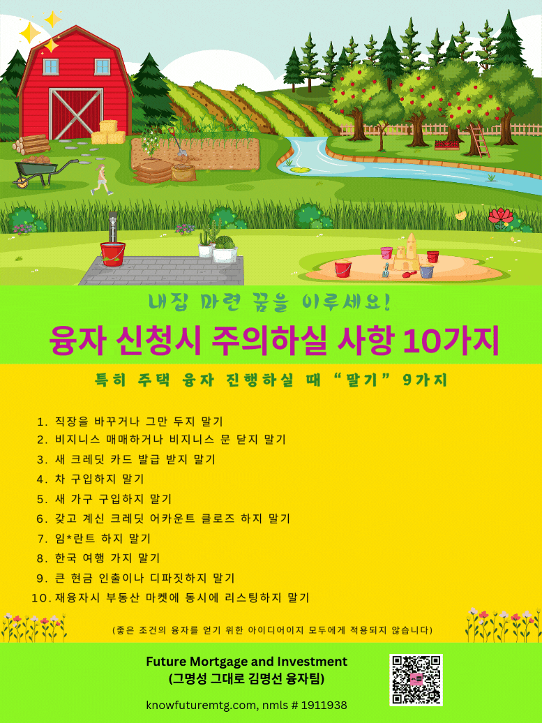 주의 사항: 융자는 돈 (신용)이고 돈 (신용) 은 빚입니다. 융자를 잘 활용하면 자산 증식이나 경제 생활에 큰 이익을 주지만, 그렇지 못할 경우, 집을 잃거나 경제적인 파국의 원인이 될수 있읍니다. 육체적인 고통이나 정신적인 고통은 911을 누르시고, 채무로 인한 경제적인 고통은 CFPB, Financial Counselor 혹은 가까운 융자 전문가에게 문의 하셔요.