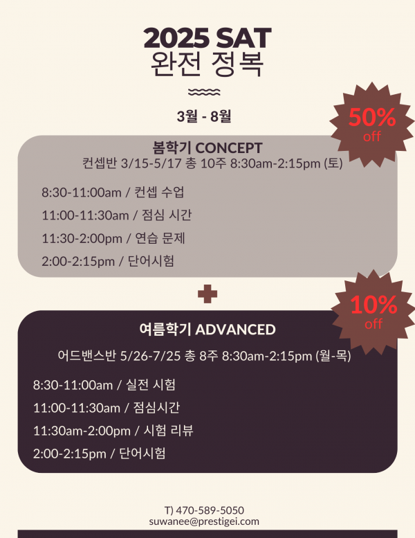 과외 [Prestige Institute] SAT 완전 정복! 봄~여름 학기 동시 등록시 10%+50% 할인 혜택!